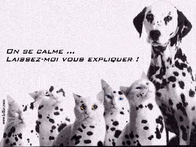Les Chats et l' Humour Certains d'entre vous ont pris l'habitute de m'envoyer des gags ou images humoristiques. J'ai pensé que celles concernant les chats pourraient faire l'objet d'une page: Un petit moment de détente ! ... M.L.Note: Les images présentées dans cette page sont la propriété des créateurs respectifs. Aucune copie ne peut être faite sans leur accord. Et pour commencer en beauté ... Faites un voeu : ... Bonne Année ! Traduction: "Je pense qu'il y a un traître parmi nous ... Carte de voeux originale "Bon rétablissement" ! Vive l'informatique ! Chat Fonctionnaire( J'en connais qui vont apprécier ... ;-) En Anglais, "Pleuvoir des hallebardes" se dit "Raining Cats and Dogs" ... Vous comprenez l'Anglais ? Surprise ! Bloup ! bloup ! Sniff ! Carnaval Elle est bonne ! Amitié Communicatif ? Que ceux qui n'ont pas bâillé m'écrivent ! Etoile & Eclair Bleu ... persistent et signent ! Le Chat Botté existe ...on l'a rencontré ! Enfer et Dalmation ! ! "Les chats ca court" disait Siné ... et bien "ca" prend aussi le Métro ! Tout cha, ... cha m'épuise ! ... Tous ces pauvres gens qui doivent défendre leur territoire ... ... pendant que d'autres ne s'en font pas ! Ces Américains, qui sont excessifs en tout ! D'ailleurs on n'est jamais tranquille ... ... et toute cette débauche pour notre jeunesse ! Gardons le sourire !Alors, merci pour votre visite ! ... Vous avez aimé nos images ? Alors envoyez-nous en d'autres ! Et maintenant la Cerise sur le gâteau ... Cliquez puis faites bouger votre souris dans le cadre jaune, près du chat, comme pour le faire jouer, et observez-le, puis ... Frottez-lui le ventre et le bout du nez et écoutez ! ! Coup de chapeau au programmeur qui a fait cela ! Note: Si vous ne voyez pas le chat, vous n'avez pas l'outil "FlashPlayer" Macromedia Vous pouvez le télécharger chez "Adobe-Macromedia" (cliquez ici) ou chez Microsoft. " Vous êtes ici chez vous ! " Retour à la page MENU.